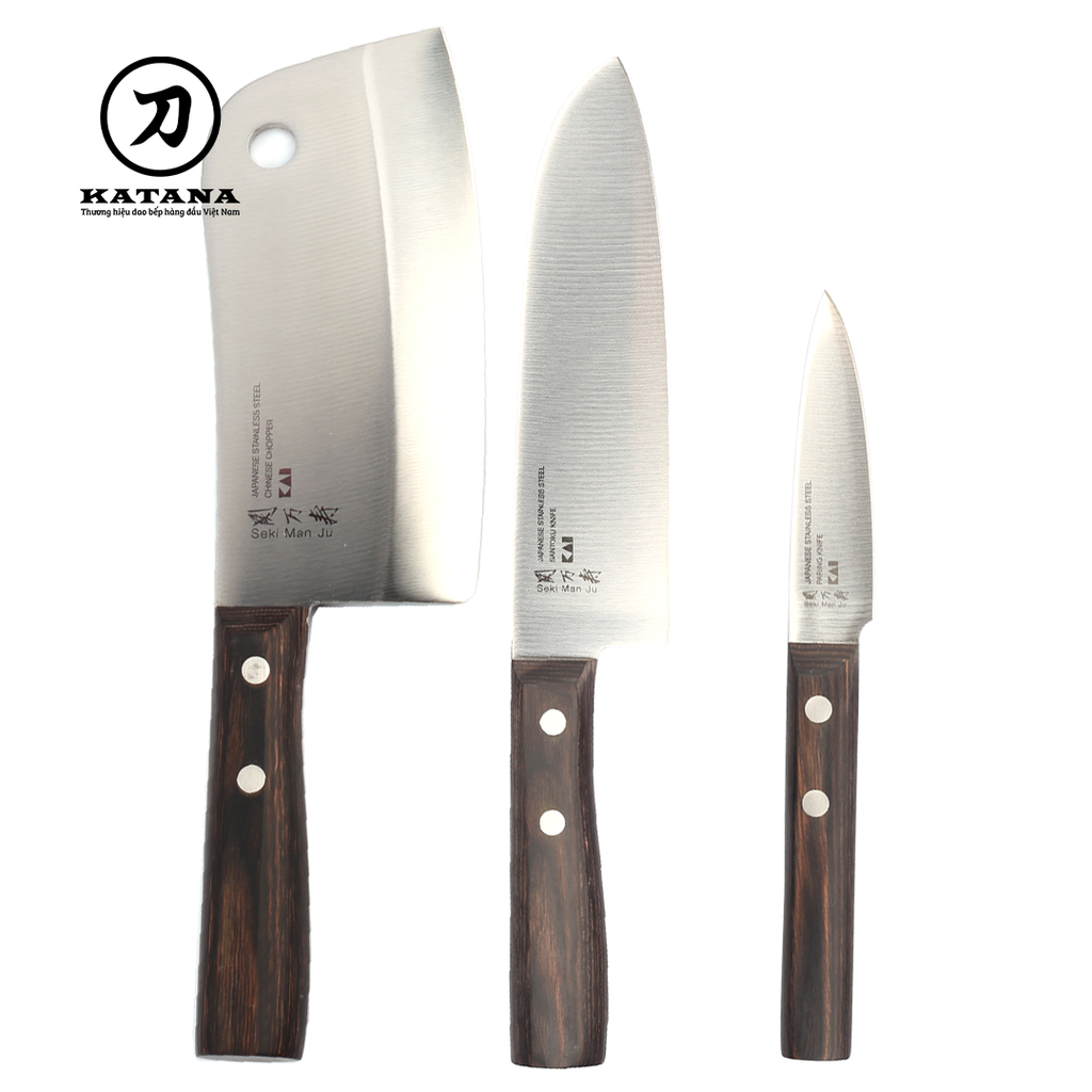 Bộ 3 dao KAI Seki ManJu cán gỗ cao cấp Nhật Bản - Dao chặt - Thái đa năng - Gọt hoa quả