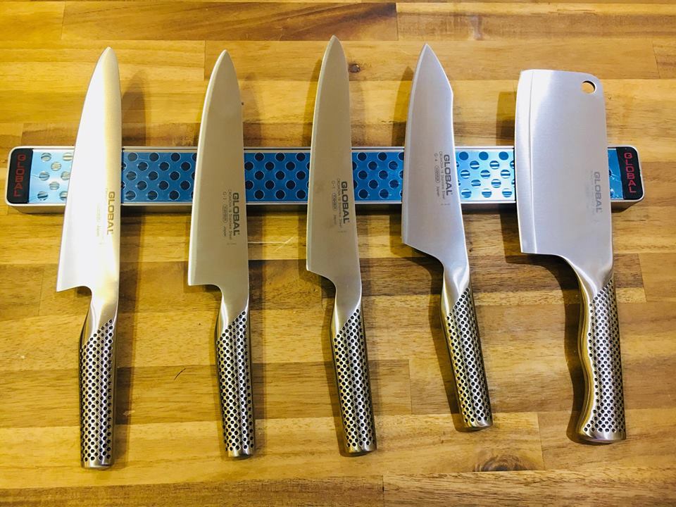 Bộ dao cao cấp Global. Thiết kế hãng dao Global thường hướng tới các bếp Âu hơn. Dao được làm nguyên khối giúp bạn dễ dàng vệ sinh. Lưỡi dao được làm thép không gỉ CROMOVA18-một loại thép siêu cứng của Nhật Bản, độ cứng lên tới 58HRC. Cán tay cầm được làm rỗng chứa cát bên trong tạo độ cân giữa lưỡi và cán dao, giúp giảm trọng lượng của dao xuống 30%. Bên ngoài cán được thiết kế các lỗ hổng nhỏ chống trơn trượt khi sử dụng.