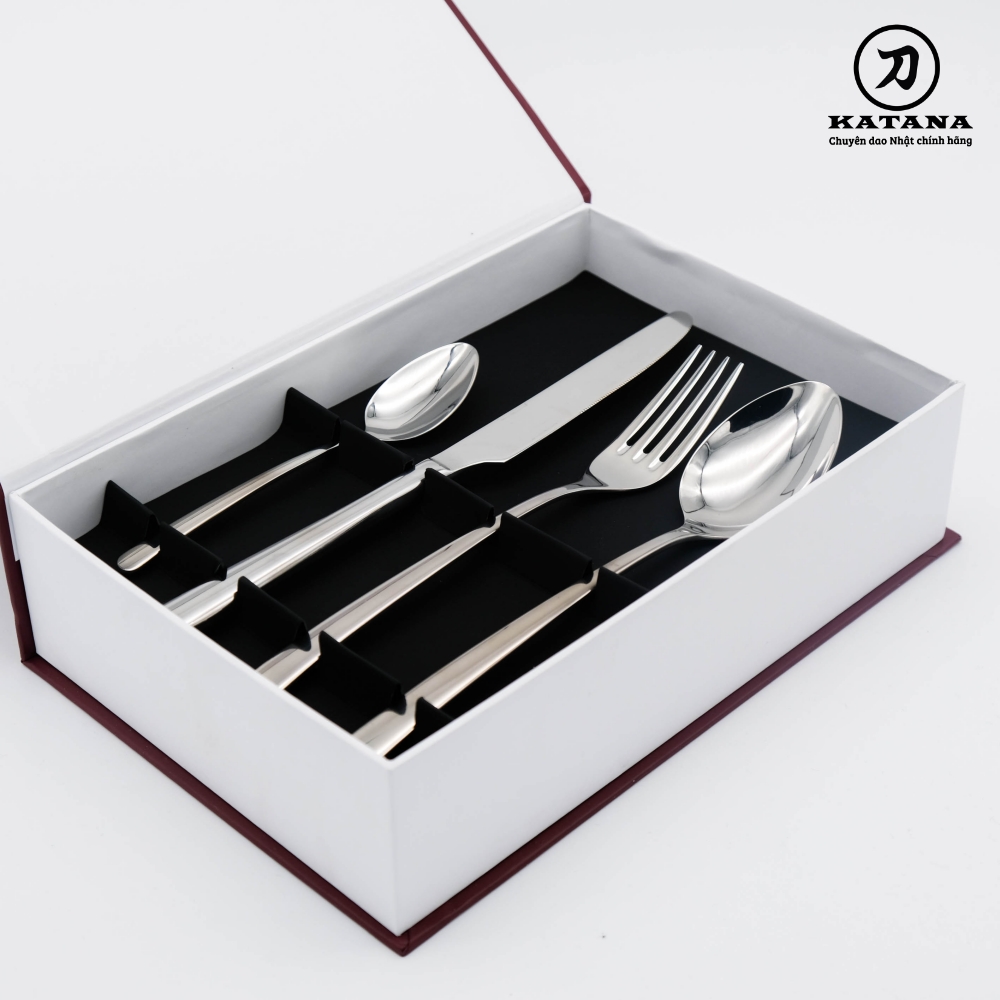 - Sản phẩm gồm 4 set dao, thìa, nĩa, mỗi set gồm 4 sản phẩm: 1 thìa to, 1 thìa nhỏ, 1 dĩa và 1 dao cắt bít tết.